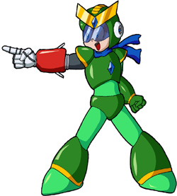 Hunter is a visitor from an apocalyptic future stranded in our present day. Only fitting for the temporally-displaced guy to be converted into the originally temporally-displaced Mega Man double by Wily. He's been the reluctant primary representative for the Mercenaries since the founding of the team.